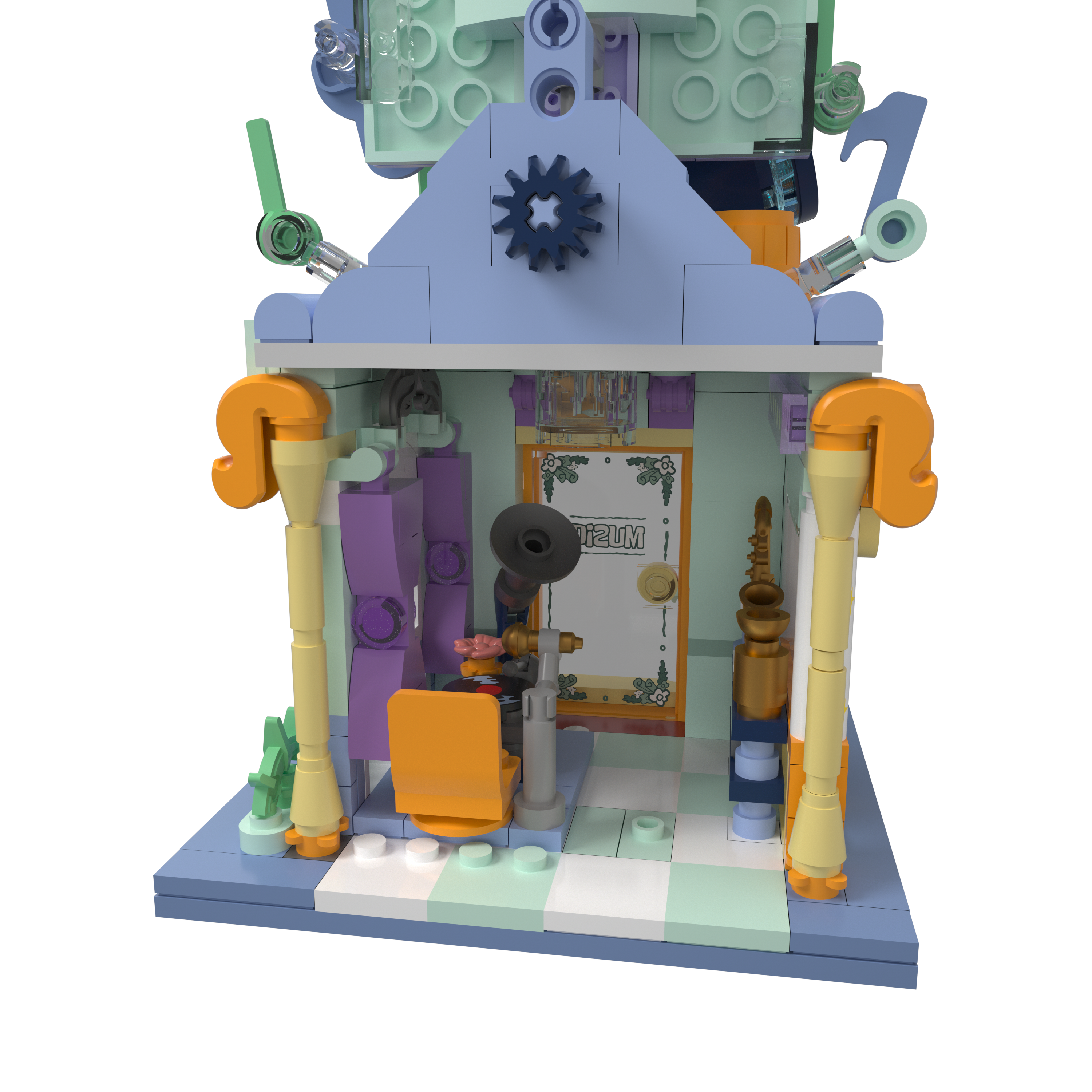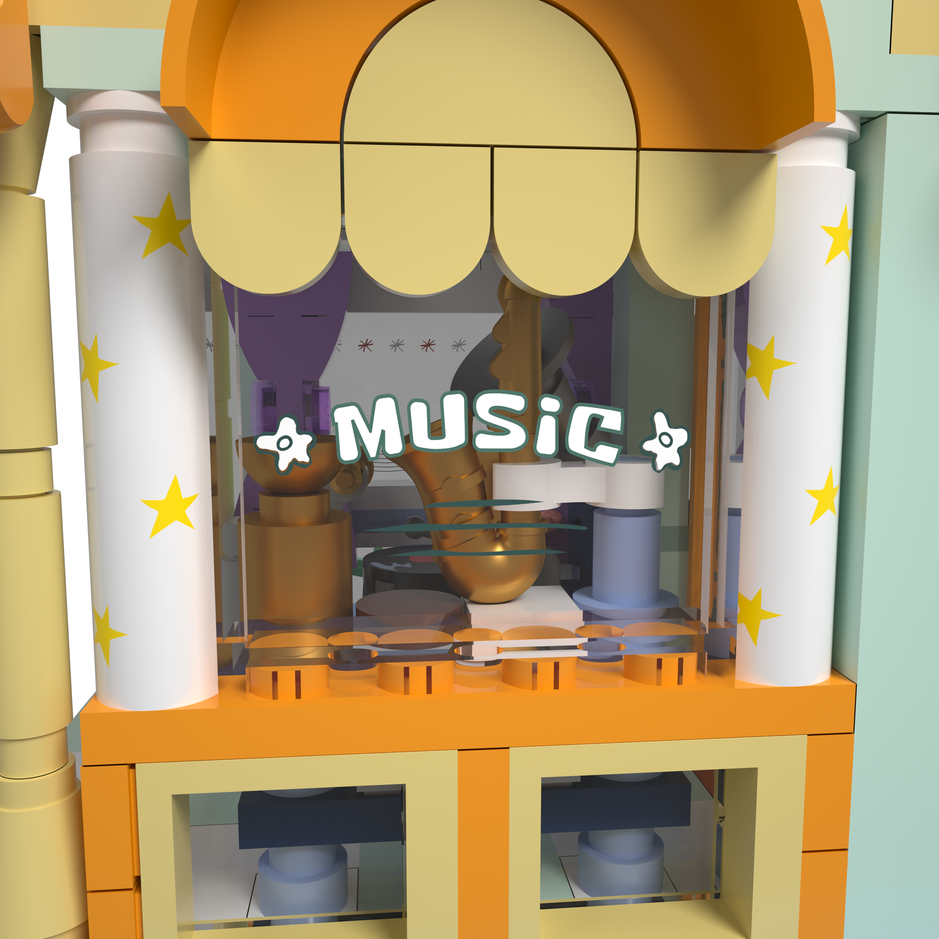 • Rooftop features musical notes, a clarinet display, and sheet music elements
