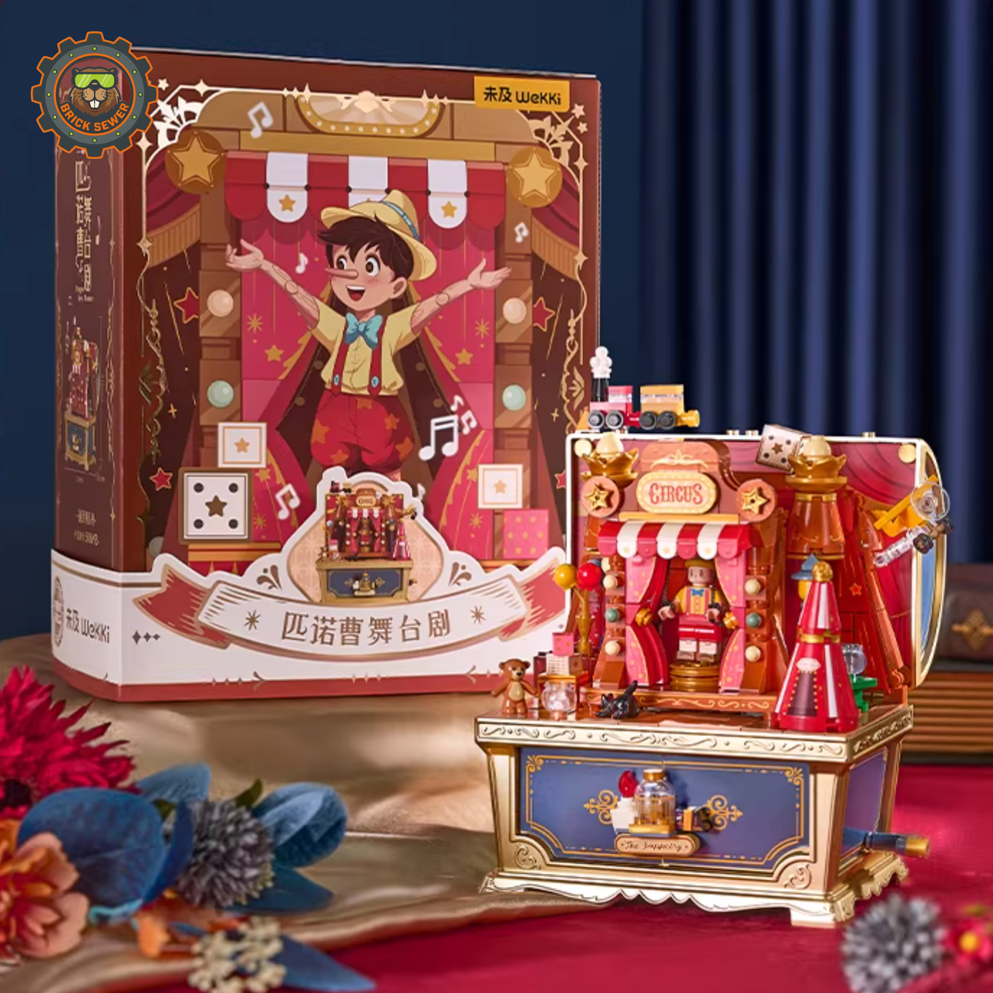 Wind the music key to open the velvet curtains — as the melody plays, Pinocchio dances at center stage, flanked by Geppetto and the Blue Fairy. Every detail, from the carved wooden panels to the swinging stage lights, celebrates the magic of classic storytelling.