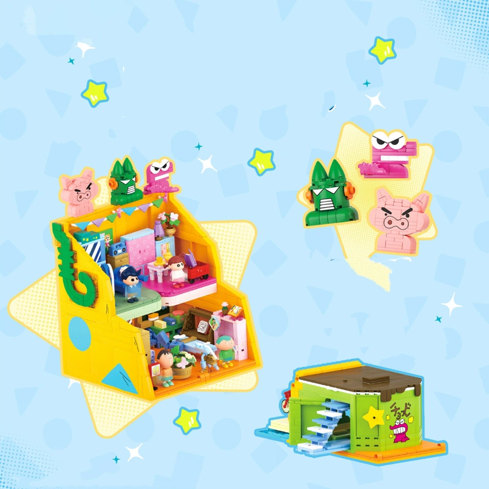 - Chocolate Cookie Box Base with Extra Accessories: Shin-Chan’s favorite toy decoration house, adding charm to the build. Retractable ladder: The side ladder of the chocolate cookie box base can be folded up for added fun.
