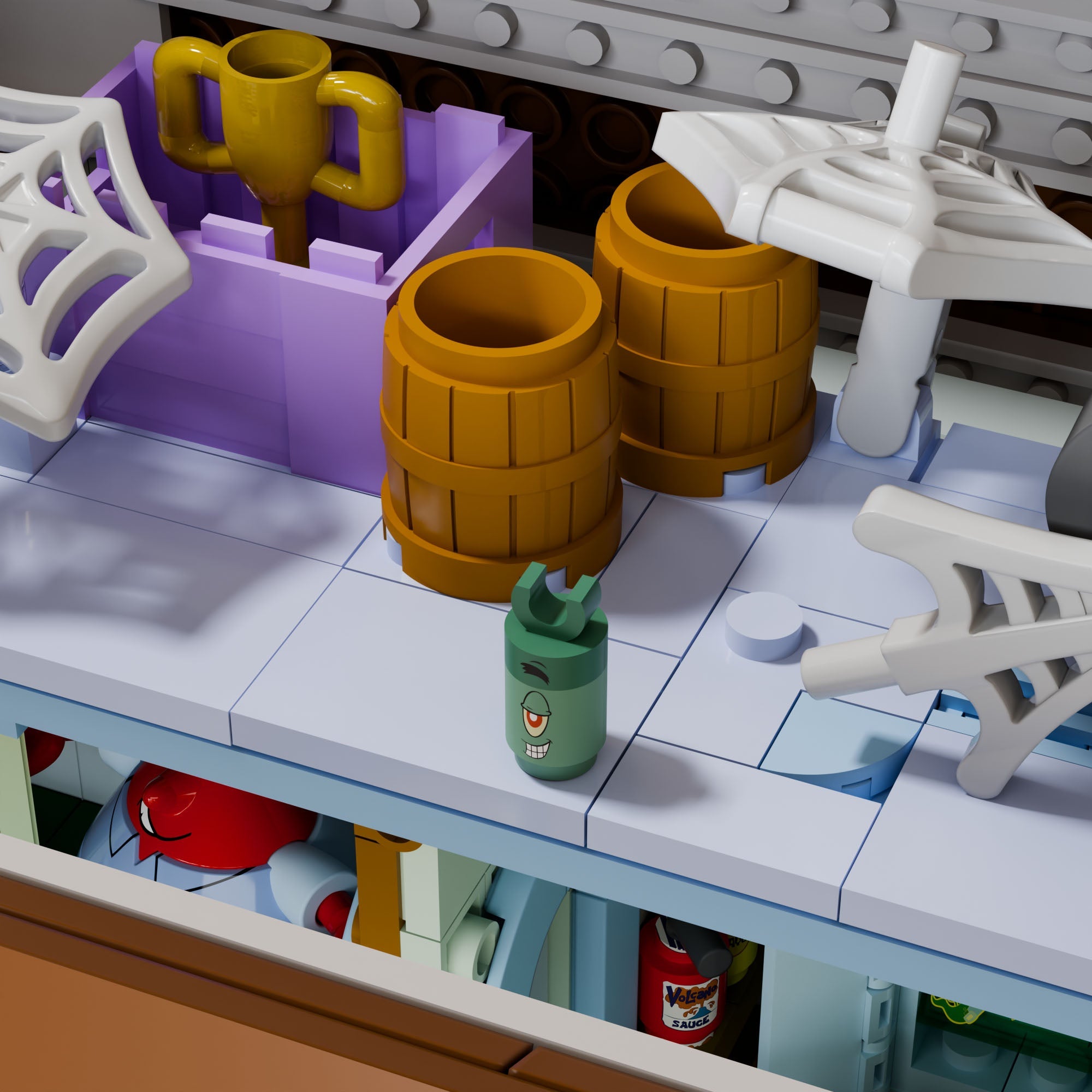 The Krusty Krab is a premium, collector-grade build built around a smooth pull-out drawer structure. Two levels and 5 rooms present a complete working restaurant. The motion is satisfying for repeat display. Integrated lighting makes the model glow at night. The set contains 2723 pieces.
