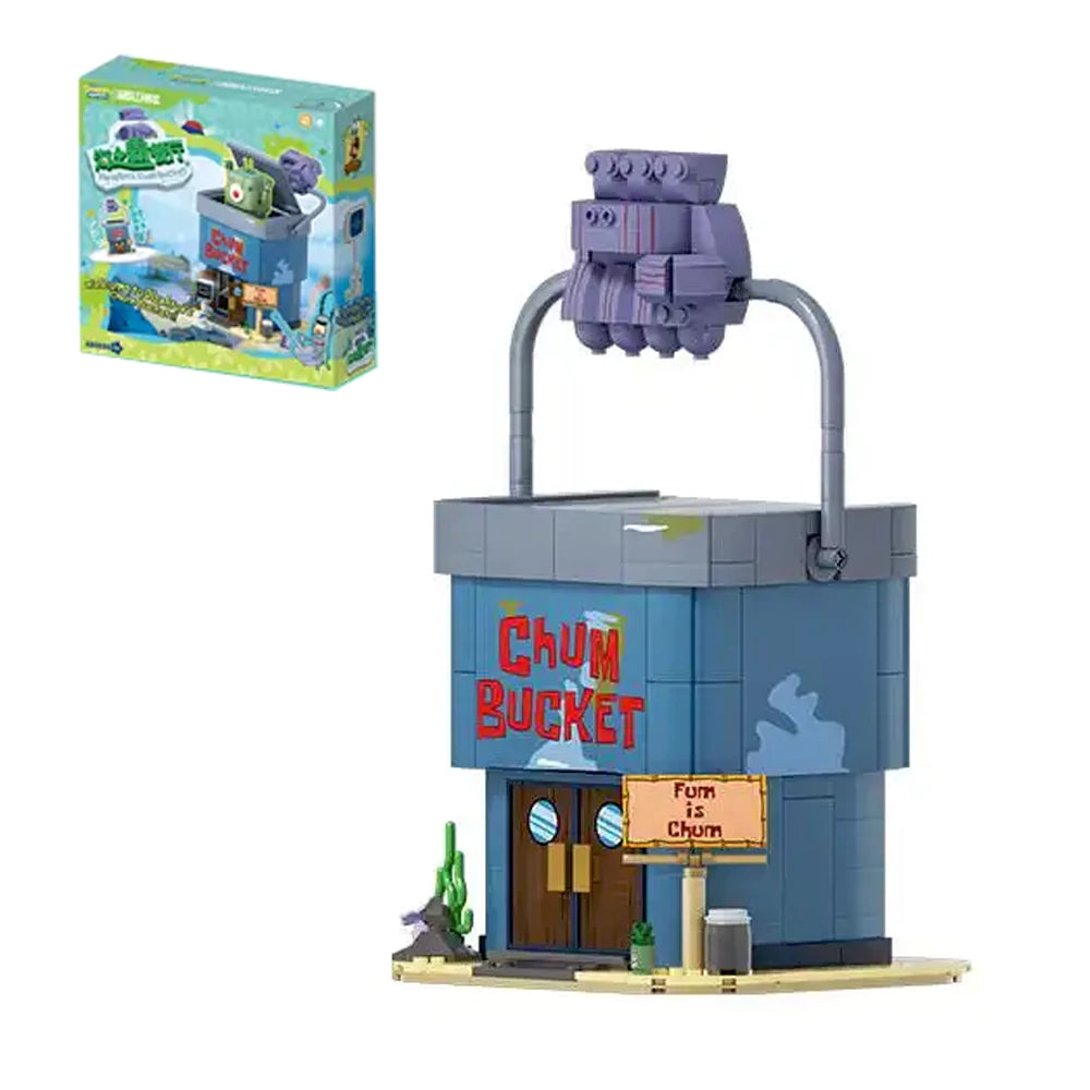 The set includes intricate details such as the counter, Plankton’s office, and the famous Chum Bucket restaurant area. It's designed to capture the atmosphere of the show’s setting, with fun and vibrant colors to bring it to life.