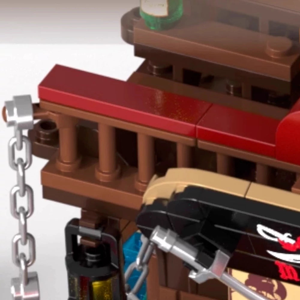 The Iambrick 31111 Pirate's Bay Market Historical is a unique pirate-themed LEGO MOC set that brings to life a medieval pirate market perched on the water. Designed with three levels, the first floor features small stalls selling fresh vegetables and fruits, capturing the essence of a bustling seaside marketplace. Pirates and traders alike gather here to exchange goods, making it a lively, historical scene. The market is uniquely built on the water, surrounded by lush sycamore trees, creating a peaceful yet adventurous atmosphere. The entire layout combines elements of medieval pirate life with a historical setting, allowing you to immerse yourself in an era of exploration and trade. The Iambrick 31111 Pirate's Bay Market Historical is perfect for those who love the medieval style and pirate themes. Build your own pirate market on the sea and experience the spirit of adventure and trade from the golden age of piracy.